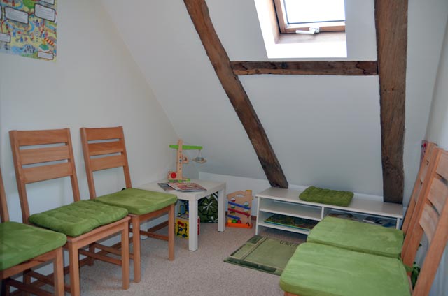 Die Praxis verfügt derzeit über zwei große, helle und freundliche Behandlungszimmer im ersten Obergeschoss. Zudem steht im Erdgeschoss ein großer Raum für Seminare und Gruppentherapien zur Verfügung. Hierbei handelt es sich um einen historischen Tennenraum. Dieser ist ebenerdig begehbar und damit auch für Rollstuhlfahrer gut zu erreichen.